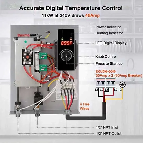 Product name | Thermomate Electric Tankless Water Heater, 11kW 208~240 Volt, on Demand Instant Hot Water Heater, Self Modulating Energy Saving, Save Space, 2.15GPM at 35°F Rise |