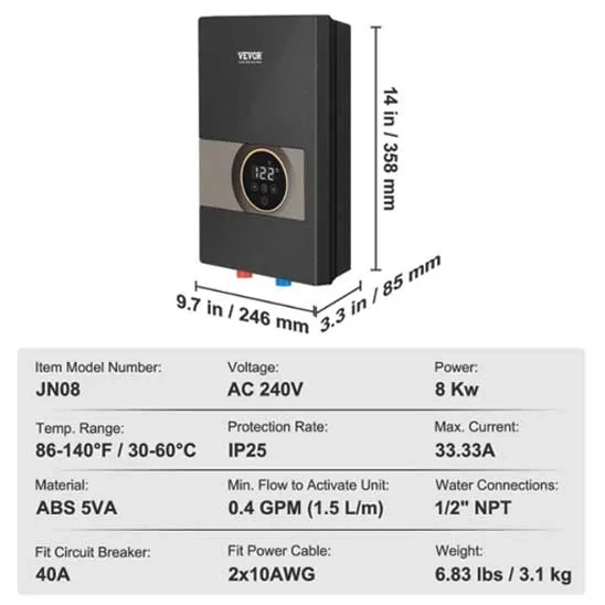 Table. Features of VEVOR Tankless Electric Instant Water Heater