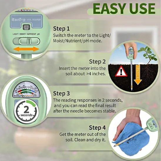 Product Name | Raintrip Soil Moisture Meter, 4-in-1 Soil Ph Meter, Soil Tester for Moisture, Light, Nutrients, pH, Soil pH Test Kit, Great for Garden, Lawn, Farm, Indoor & Outdoor Use |