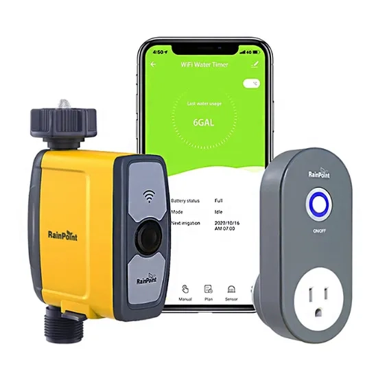 The RAINPOINT Smart sprinkler irrigation system is a programmable irrigation controller system that controls watering according to soil moisture. This product is also compatible with 2-zone WiFi sprinkler timers to expand your irrigation system. The RAINPOINT website offers a smart plus garden watering system, which allows you to easily control two different irrigation areas. The RainPoint APP UI 2.0 is simple and intuitive and can be used from your phone to water your plants. The wifi water timer uses voice commands that allows you to turn the watering timer on. When it is raining or the soil moisture is high, the WiFi hose timer will automatically delay watering. The device includes three different watering plans including start time, duration, and watering frequency, and two watering modes including irrigation mode (suitable for lawn and pool) and mist mode. (suitable for misting system, summer outdoor cooling, and dust reduction).