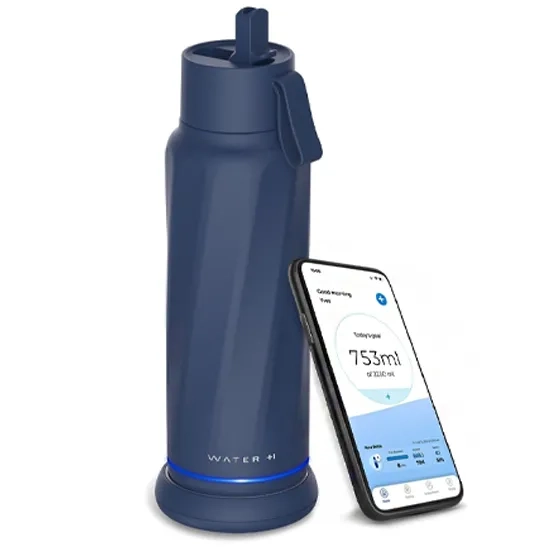 This 24-ounce hydration bottle measures the intake of liquids using the connected smart lid, as well as providing real-time temperature readings. You can customize the hydration goal based on your personal data including your age, gender, weight, and water needs. The lid contains a battery that can be used for up to 12 days before needing to be recharged. This smart water bottle tracker requires iOS7+ and works with different Apple devices to track and monitor your daily, weekly, and monthly progress. This water bottle is not suitable for hot liquids.