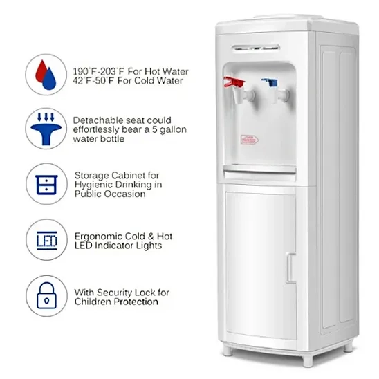 Gymax 5-gallon top load water dispenser is perfect for getting cold water in the summer and hot water in the winter. It has switches to turn off the heating and cooling, which helps to save energy. This product has a cabinet for storing cups and drinks. The hot water tap has a safety lock to prevent children from accidentally turning it on. The Gymax hot and cold water dispenser is nice and suitable for your homes and offices. Get a useful and healthy way to drink water with this unit.