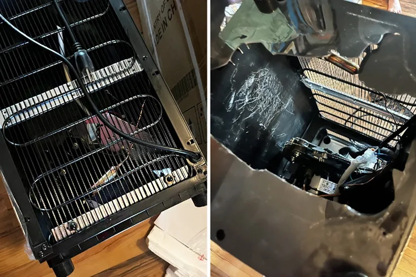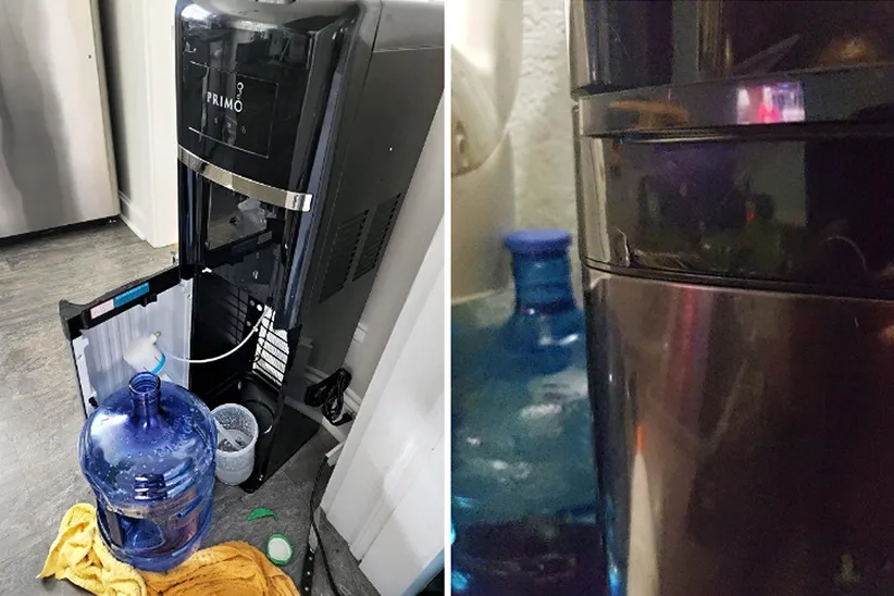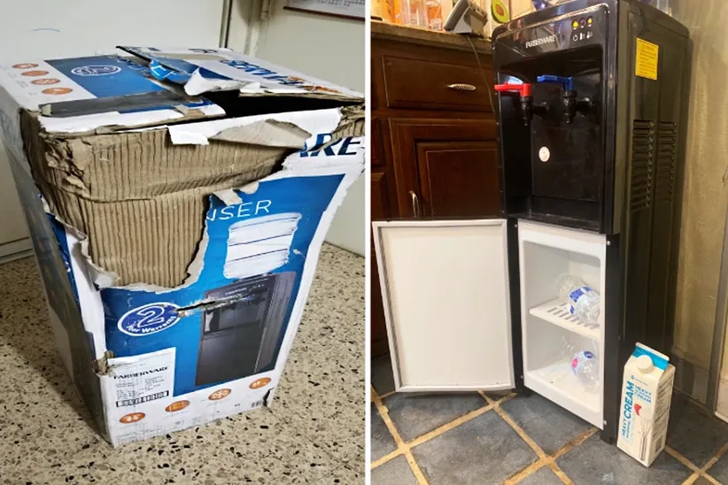 The metal covering on the top of the water dispenser was damaged during the delivery process.