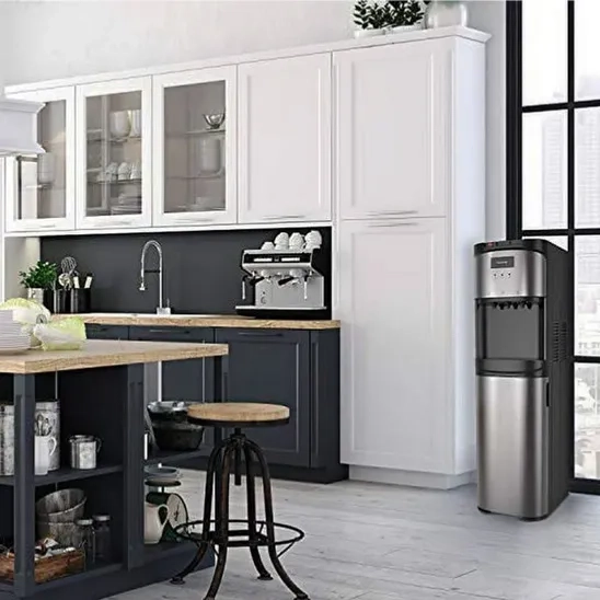 The Avalon 3 temperature bottom load water dispenser is suitable for drinking cold water, tea, coffee, and other hot drinks without adding ice or boiling. It lets you select between 3 different temperatures. It is very simple to use, and you can drink water at the desired temperature only by pressing the button. Do not worry about burning your children's hands anymore; the Avalon 3 temperature bottom load water dispenser has a child safety lock on the hot water spout. This product has a 9-inches space below the spouts to accommodate large cups or bottles. This water dispenser has a modern stainless-steel cabinet that will look great in your home or office. The nightlight feature helps you see the water spouts at night. It also shows you when the bottle needs to be changed. It works with 3-5 gallons of water bottles. The Avalon water dispenser has a Bioguard coating on high-touch surfaces to stop bacteria from growing.