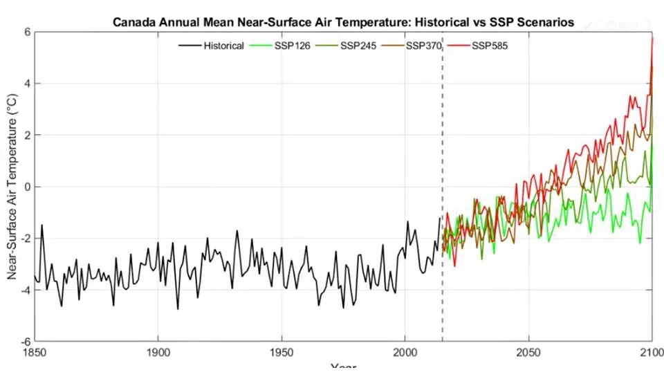 Climate change is a global threat with long-term effects on sectors such as agriculture, biodiversity, and public health. Shifting temperature patterns increase the risk of food insecurity and threaten species' survival due to accelerating biodiversity loss. Rising temperatures also exacerbate health crises, such as the spread of vector-borne diseases and antimicrobial resistance (Abbass et al., 2022). Despite these clear impacts and risks, many climate impacts remain unclear due to interdisciplinary knowledge gaps and uncertainties (Rising et al., 2022). However, global awareness and support for climate action are growing. A recent survey in 125 countries found that 89% of people want stronger political action, but widespread misperceptions of others' willingness to act still hinder collective efforts (Andre et al., 2024). The urgent need for action to reduce the profound effects of climate change on human livelihoods and the environment is essential, and a more accurate understanding of temperature changes is required. Climate change in the Arctic is projected to increase the prevalence of diseases and accelerate the spread of environmental contaminants, posing significant risks to both human and wildlife populations, particularly in the neighboring country, Canada (Dudley et al., 2015). In this article, we seek to present temperature trends in Canada as an example of countries affected by climate change under the latest climate scenarios.