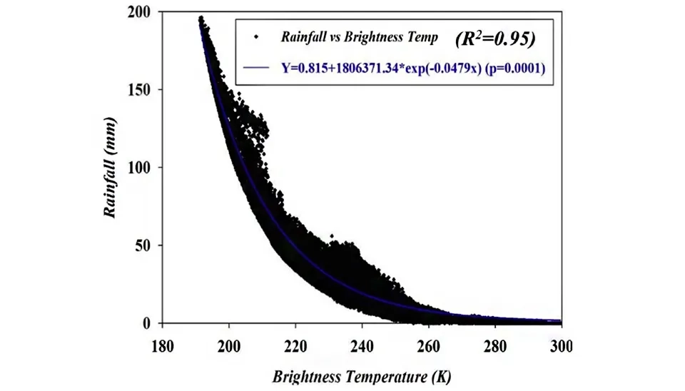 According to this scatter plot, cloud tops (Tb < 20 K) cause the heavy rainfall (>60 mm/day). Moderate rainfall (<60 mm/day and >20 mm/day) is more likely to occur in medium clouds (>220 and <245 K), and light rainfall (<20 mm/day) occurs in low-level clouds (Tb > 245 K). Generally, there is a negative correlation between cloud temperature and precipitation, indicating that as the temperature increases, the amount of precipitation tends to decrease (Mishra, 2019).