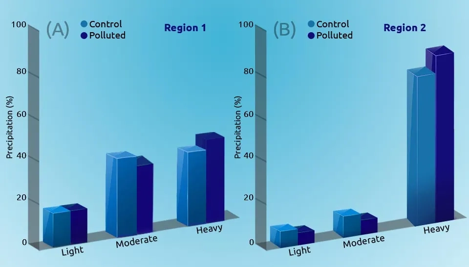 The following graphics confirm that during the heavy precipitation, an increase in aerosol amount leads to a dramatic growth but in moderate and light precipitation case, this relation becomes inverse: