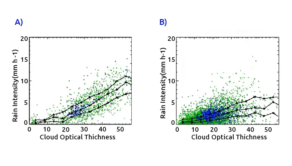 The above figure shows the relationship between cloud optical thickness and precipitation in two different situations. The blue dots indicate a cloudy grid cell over the sea, while the green dots are over the land. According to this scatter plot, the correlation between precipitation intensity and cloud optical thickness is positive .