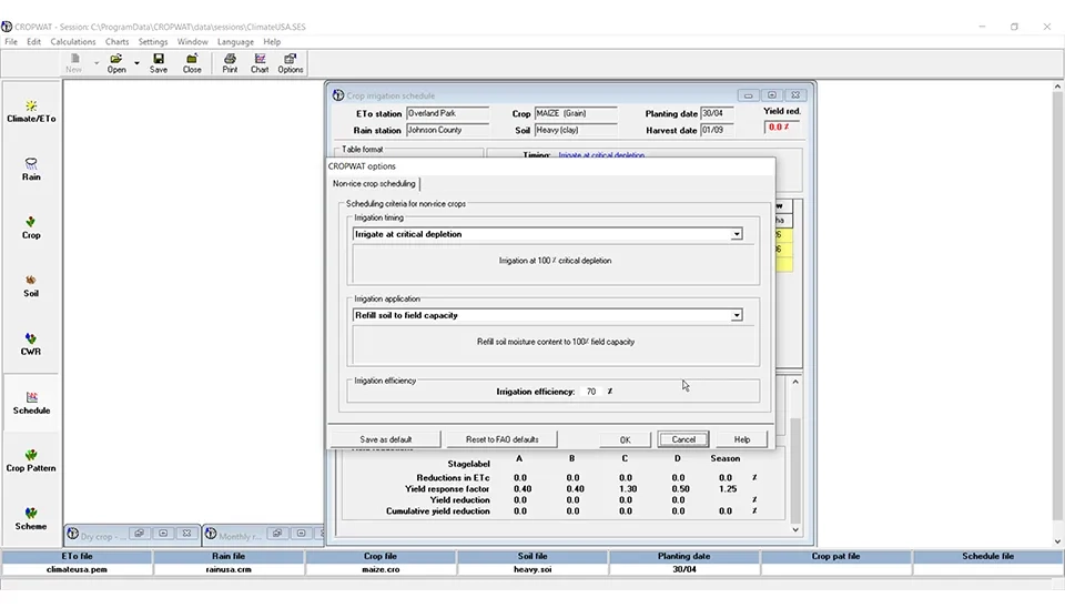 The application is in response to how much to apply, Refill soil to field capacity if you intend to refill soil to field capacity (FC). Field efficiency is 70 percent, although you can change all of these parts in the CROPWAT Options window as in the following section.