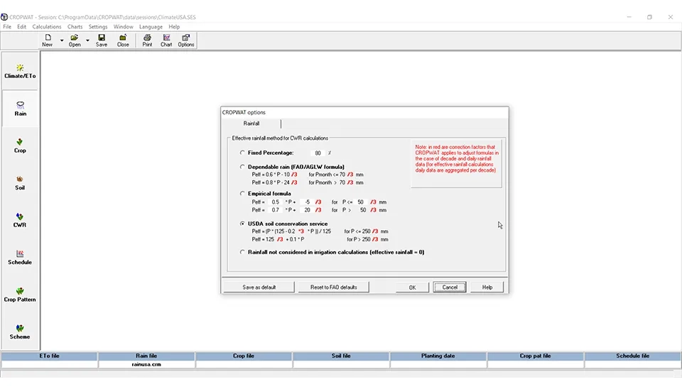 In this section, we can select one of these four methods for calculating effective rainfall. The first method is fixed percentage, which is 80 percent by default, but it can be changed manually. A fixed percentage equals 80%, which means that 80% of rainfall is effective. The second method is the dependent rain formula. And the third method is the empirical formula. The fourth method is FAO’s recommended method, USDA soil conservation service. The last method has stated rainfall is not considered in irrigation calculations (effective rainfall = 0). You can see the CROPWAT rain options in Figure 13.