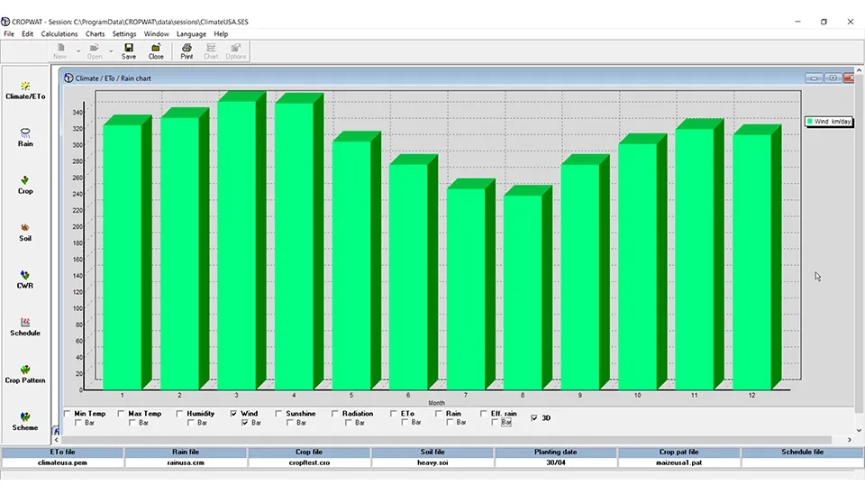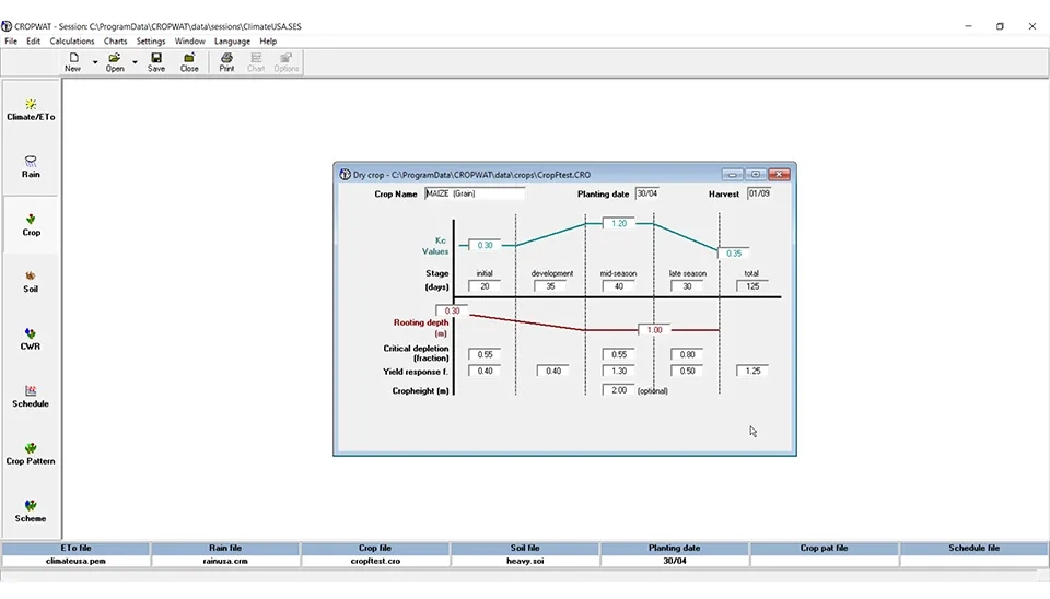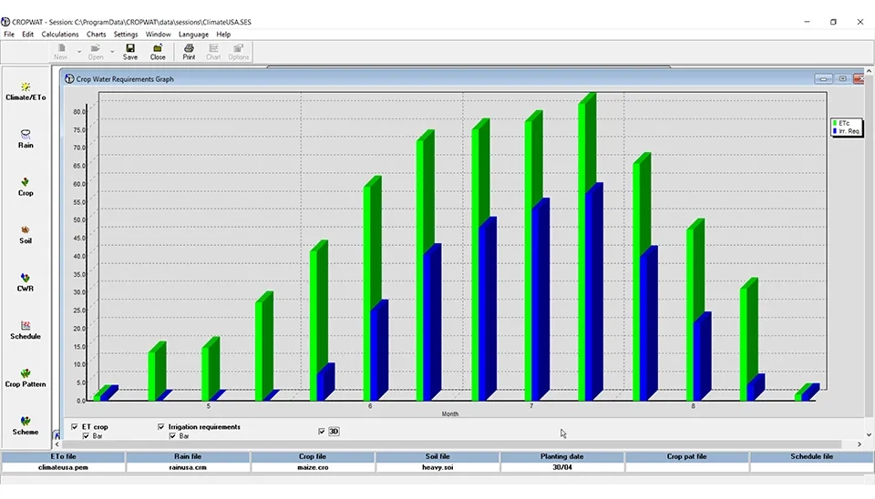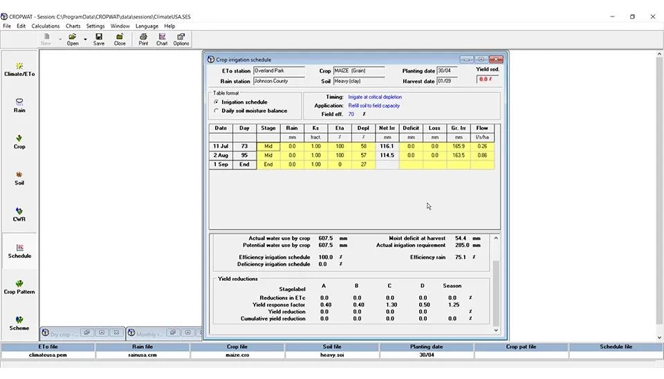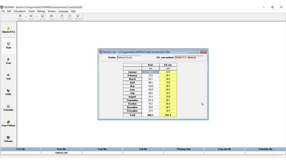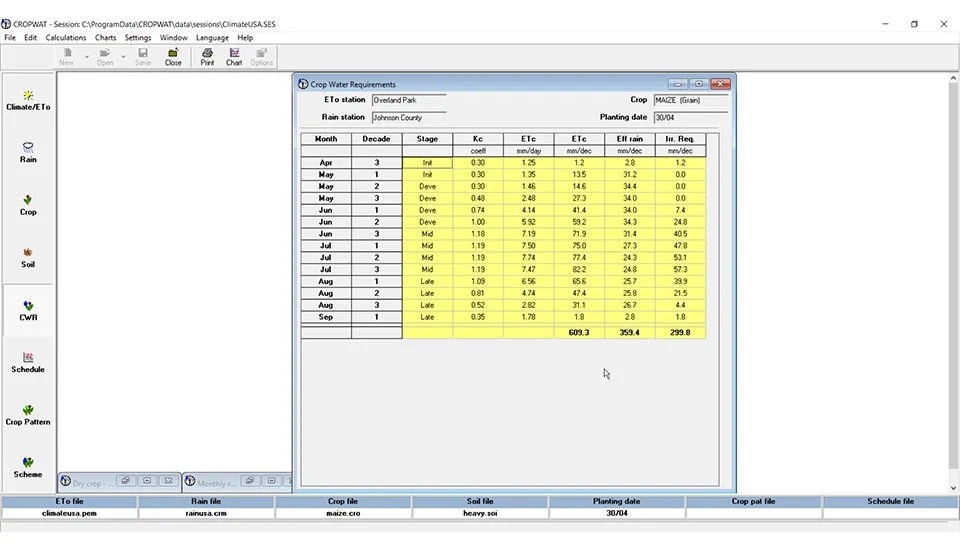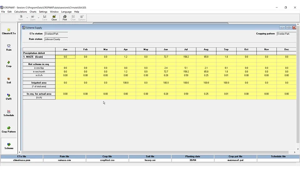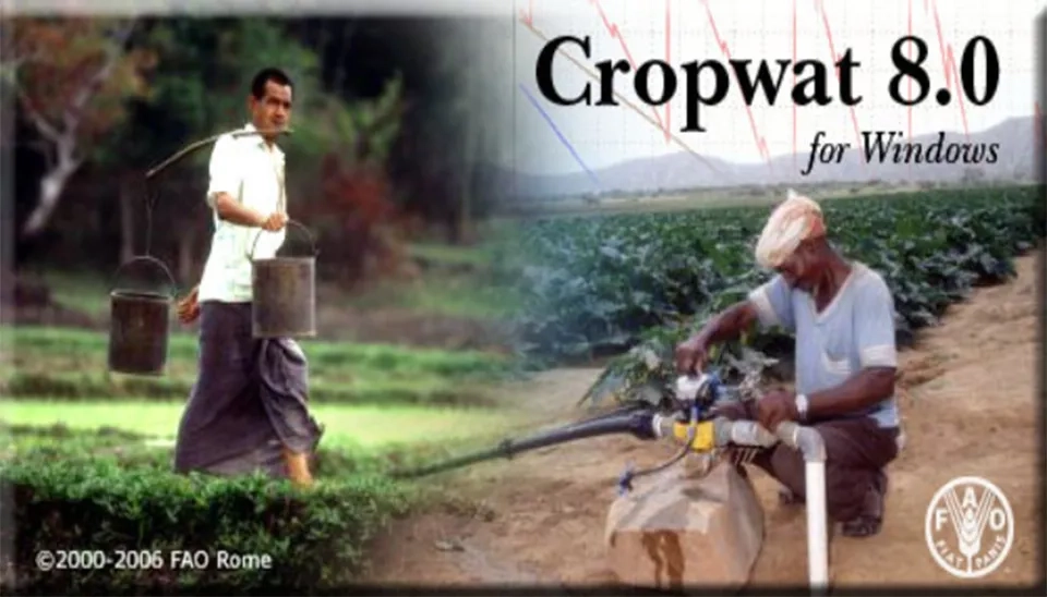 CROPWAT 8.0, which was developed by the Land and Water Development Division of FAO, is a decision-support tool designed to calculate crop water and irrigation requirements that uses soil, climate, and crop data. The software facilitates the development of irrigation schedules under various management scenarios and estimates water supply for diverse cropping patterns. It also evaluates irrigation practices and estimates crop performance in both rainfed and irrigated conditions. CROPWAT uses methodologies outlined in FAO's Irrigation and Drainage Series No. 56 ("Crop Evapotranspiration") and No. 33 ("Yield Response to Water").