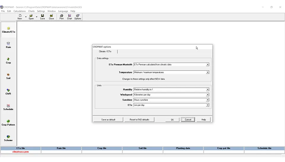 The Climate/ET0 window has its own Option window. In this window we can change data settings and units. In the Data Setting section, we can select that ET0 Penman-Monteith calculated from climate data or temperature data. Also about the section Temperature, we can select Minimum/Maximum Temperatures or Average Temperatures. In the Units section, there are humidity, wind speed, sunshine, and ET0. In the Humidity section, we can consider the relative humidity in percentage or vapor pressure in KPa. For the Wind Speed Section, we can select kilometers per day (more common) or meters per second. We have three options in the sunshine section. The first one is based on hours of sunshine. The second option is a percentage of daylength, and the last is a fraction of daylength. The next part in the Units section is the evaporation and transpiration potential of the reference plant (ET0). The ET0 can be in millimeters per day or millimeters per period. If you want, it is possible to save these changes as defaults. Additionally, in the CROPWAT options, there is an option called reset to FAO defaults if you want to go back to the default settings of FAO in this software. You can see these items in figure 9.