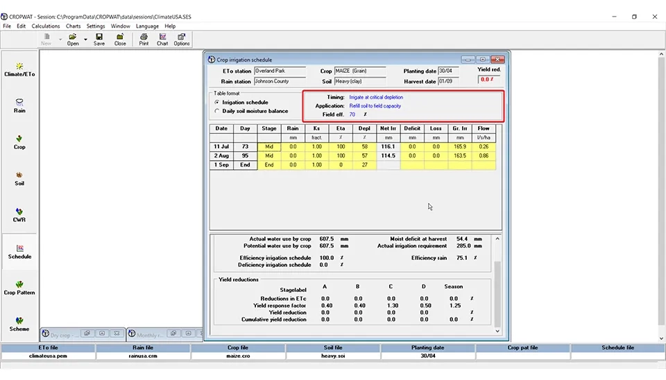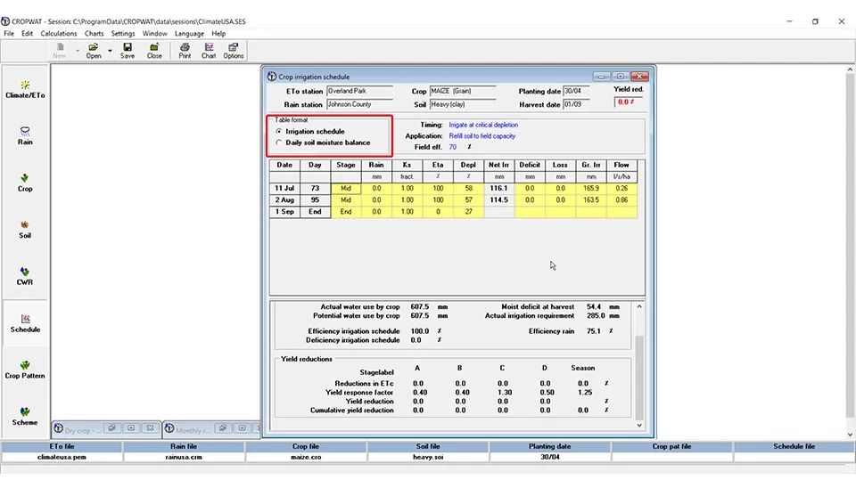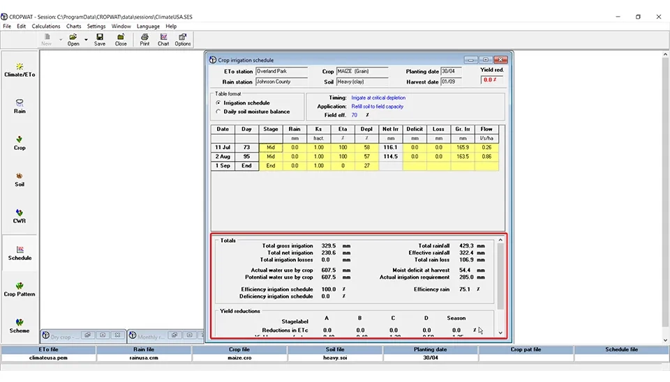 The next output is related to the schedule. In this section, we can see the crop irrigation schedule as shown infigure 20. At the top of the crop irrigation schedule, we can see the ET0 station (Overland Park), the selected plant name (Maize (grain)), the planning date (30/04), the yield reduction (0.0%), the rain station (Johnson County), the soil (heavy clay), and the harvest date (01/09). Through a number of earlier steps, we inputted all of this data into the CROPWAT software.