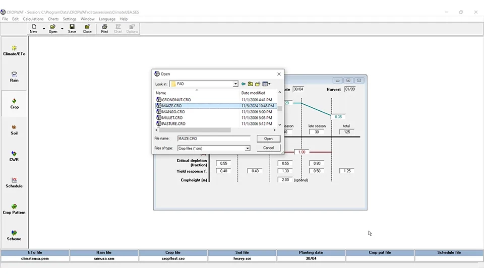 Crop name: We can select a crop from the FAO defaults (for example, maize (grain)), but how can we do this? While the crop window is opened, we select Open from the File menu, as shown in the following figure, to access different types of plants and their coefficients in the FAO file. By selecting a type of plant, other required coefficients of this section are determined automatically, but we can enter data manually if it is available. In that case, the data will be obtained with the help of equations and tables in FAO Irrigation and Drainage Paper 56. In the following, we explain other parts of this Crop window (Figure 16).