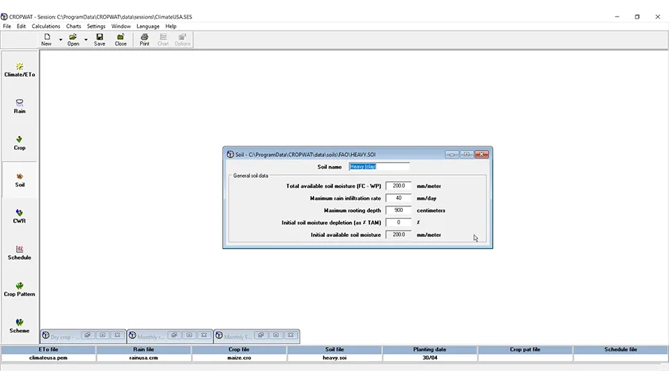 This software consists of four input tabs. The first is Climate/ET0, the second is rain, the third is crop, and the last is soil data. In the following, each of them will be discussed. Let us introduce the first tab named Climate/ET0 as the first input data requirement.
