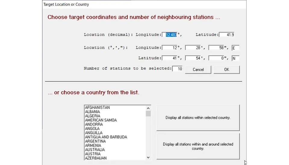The FAO states that the CLIMWAT software in its database has the long-term monthly mean values of the following climate parameters required for the calculation of potential evapotranspiration according to the Penman-Monteith method: mean daily maximum temperature, mean daily minimum temperature, mean relative humidity, mean wind speed, mean sunshine hours or solar radiation, total and effective monthly precipitation. All variables, except potential evapotranspiration, are direct observations or transformed observations (FAO-Land & Water). After installing this software, you can see the target location or country. In this window, you have ways to receive station information. You can see the figure 5. In the first way, by entering the latitude and longitude, you will be provided with the information from the nearest synoptic station. In the second method, you can select the country in question, and all the stations whose data is in this database will be displayed to you (see figure 5).