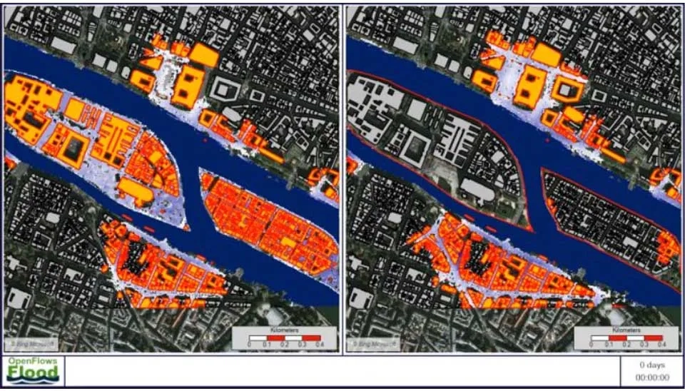 Digital twins technology has a vital role in Netherlands flood management strategy for increasing water resilience. The Delta Program uses digital twins of the Dutch water system to simulate flood events, assess risks, and develop strategies for flood prevention and mitigation, involving multiple big and local stakeholders and communities. Delta Program facilitates real-time tracking and predictive assessment of the water system's functions, allowing officials to implement preventive actions ahead of potential flood incidents (Delta Program) . The model can simulate floods across different climate scenarios, tidal conditions, and river currents to help stakeholders in making informed choices about infrastructure spending, flood protection, and emergency preparedness planning. Additionally, the MAGES system in Paris integrates 2,000 sensors with real-time data, a hydraulic model consisting of nearly 23,000 computational elements to detect and control combined sewer overflows in the city’s sewer system (Tabuchi et al., 2020). Additionally, The CSOnet system (Indiana, US) uses 120 sensors and 12 actuators along with an online hydraulic model to increase the storage and transmission of the sewer network (Montestruque and Lemmon, 2015). Also, Louisville MSD (Kentucky, US) utilizes an optimization system that incorporates monitoring data, weather forecasting, and data analytics to maximize the wastewater system's capacity (Tao et al., 2020).