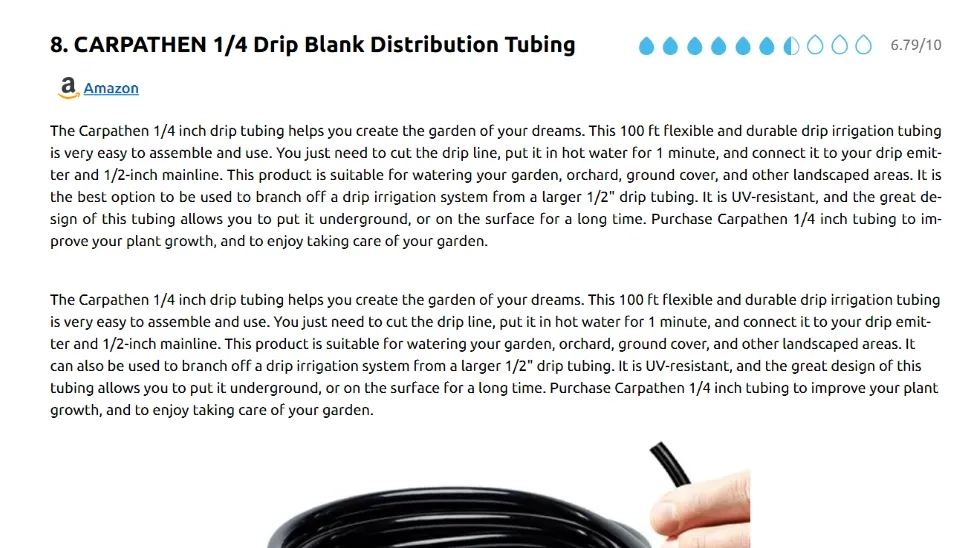 This buying guide outlines the essential factors to consider when selecting the best drip irrigation tubing. By following these criteria, you can make an informed decision that aligns with your needs. Additionally, this buying guide suggests checking Waterlyst’s Bayesian ranking to consider user reviews and comments, as these can provide valuable insights from those who have already used the product. It’s also important to consult our article, "10 Best Drip Irrigation Tubing for Watering Your Plants," which serves as a great starting point for narrowing down your options. The article ranks the products based on Bayesian ranking methods, offering a more reliable comparison than traditional methods. As highlighted in this buying guide, the MIXC 1/4-inch Drip Irrigation Tubing (50-foot) ranks first, made from high-quality, low-density polyethylene. This tubing is durable and weather-resistant, making it suitable for long-term use in a variety of environments. Whether buried underground or placed on the surface, it is highly flexible and easy to install in gardens, farms, or landscaped areas. Compatible with various emitters, misters, and fittings, the MIXC tubing is ideal for small, tight planting areas with curves and switchbacks. It also conserves water by saving up to 70% and reducing overspray, ensuring that your plants receive efficient watering without wasting water on surrounding soil. Be sure to consider these features when making your decision, as detailed in this buying guide.