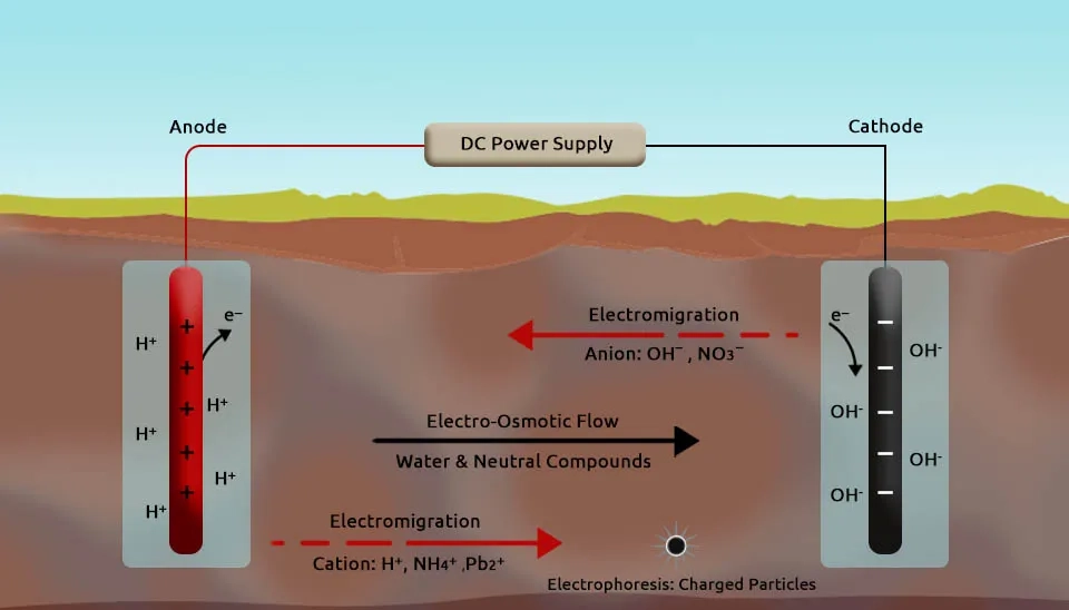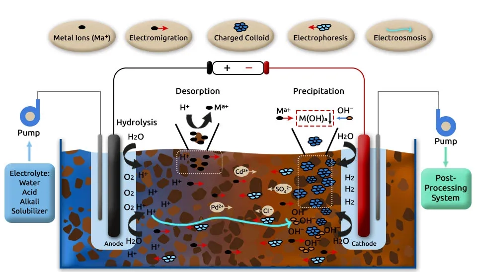 Electromigration is the movement of charged ions dissolved in an aqueous medium towards an electrode of opposite polarity under the influence of an electric field. Charged ions, such as heavy metal cations or anions, migrate through the pore water in response to electrostatic force. The anions move toward the anode and cations move towards the cathode. Electromigration is particularly effective for mobilizing heavy metal ions in pore water by facilitating their directed transport toward specific electrode zones for collection or neutralization.