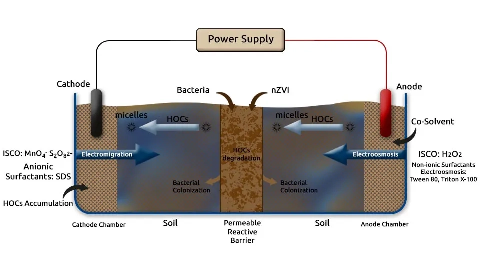 Electrokinetic remediation has been used as a promising solution for the removal of organic contaminants in soil, particularly hydrophobic organic compounds (HOCs) and other persistent pollutants. These compounds are challenging to remediate due to their low solubility and lack of charge, which limits their remediation via electromigration and electroosmosis. Consequently, agents such as surfactants, co-solvents, and nanoparticles are introduced to enhance contaminant solubility and promote in situ degradation. Electrokinetic remediation is also often combined with complementary technologies like in situ chemical oxidation, bioremediation, and phytoremediation to achieve efficiency in contaminant removal. These hybrid approaches enable the decomposition of organic contaminants directly within the soil matrix through the delivery of chemical agents or biological enhancers. Further improvements depend on optimizing these combinations and integrating facilitating agents to overcome site challenges (Cameselle and Gouveia, 2018).