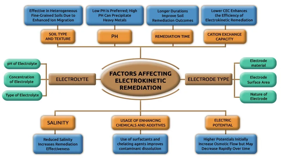 The efficiency of electrokinetic remediation depends on various soil and operational factors. Soil type and structure significantly influence contaminants mobility. For example, fine-grained soils like clay are more amenable due to their surface charge and pore water content. The pH as well as pH gradients that are created by electrolysis reactions, also play a critical role by changing soil chemistry, enhancing contaminant dissolution, and causing precipitation near electrodes. The type and concentration of contaminants, as well as the conductivity of the soil pore water, impact their migration and removal rates. Applied current density and soil saturation further affect ion and fluid movement and determine the contamination transport rate. Soil conditioning with surfactants or chemical reagents can improve remediation by increasing the mobility of contaminants. For example, electroplating, precipitation, or complexation can remove contaminants by migration to electrodes. Moreover, field conditions such as organic content, water content, and contamination distribution must be considered to optimize the process. These factors should be considered to achieve successful removal of contaminants in soil by electrokinetic remediation (Virkutyte et al., 2002).