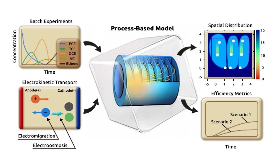 The modeling approach for multidimensional electrokinetic transport integrates process-based analysis to capture the complex interplay between physical, electrostatic, and biogeochemical processes in saturated porous media through an electrokinetic mechanism. The modeling framework and governing equations enable a deeper understanding of the mechanisms driving the remediation process and support the optimization of this technique (Sprocati et al., 2020), which are discussed below: