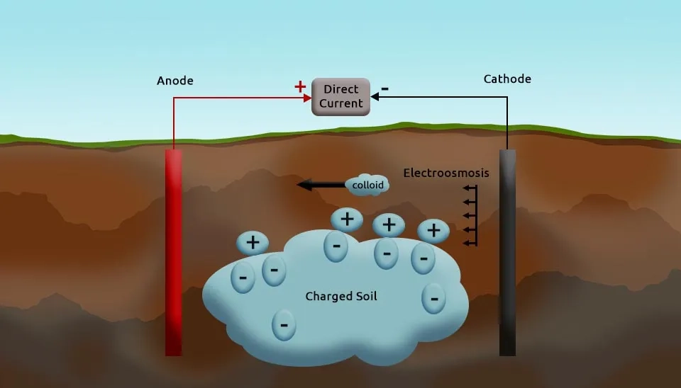 Electroosmosis is the movement of pore water and its dissolved constituents in a porous medium under the influence of an electric field. This mechanism interacts with the electric field and arises due to the negatively charged surfaces of soil particles, which generate a net flow of pore fluid from the anode to the cathode. However, the direction of flow can change if the soil’s surface charge is altered through electrolysis reactions and processes. Electroosmosis transports both charged and non-charged species in the fluid and is particularly useful for mobilizing organic pollutants or other contaminants that are dissolved in pore water.
