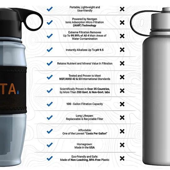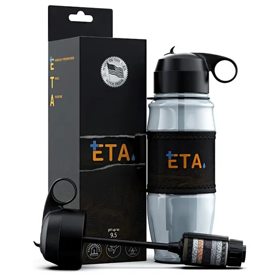 The ETA 28oz alkaline filtering water bottle is ideal for camping, hiking, backpacking, etc., and can remove up to 99.99% of harmful contaminants, including lead, arsenic, fluoride, chlorine, detergents, pesticides, copper, bad taste and odor, radiation, radiological contaminants, etc. It protects the nutrients and mineral value from filtration, as well as converting the clean water into alkaline water. The "IAMF" technology has a revolutionary porous micro-filter system that removes, absorbs, bonds, and chelates contaminants. The portable, user-friendly design easily fits into any carry-on, making it the best on-the-go portable filtered water bottle. The filter produces up to 100 gallons of clean and safe drinking water. This product is BPA-free and made in the USA.