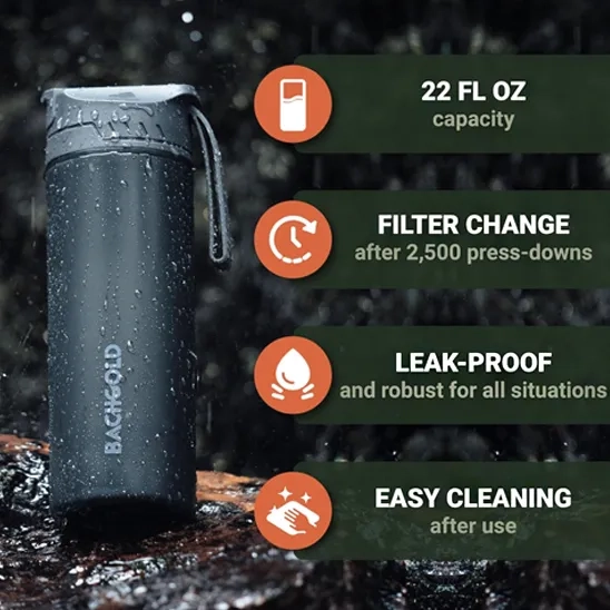 It purifies 24oz (710 ml) of water and requires no setup time or prolonged waiting. You can fill the bottle from any suspected freshwater source, and it provides you with clean and safe drinking water. As dirty water is pressed through the purifier media, electro-adsorption permanently binds all pathogens. Then, multiple layers of ultra-powdered activated carbon filter out other contaminants. This product is well designed for a hiker, traveler, camper, etc. seeking versatility, ease of use, and fast-flow purified water for drinking. Buy the GeoPress 411-BCO water filter bottle, which can replace 300 plastic water bottles.