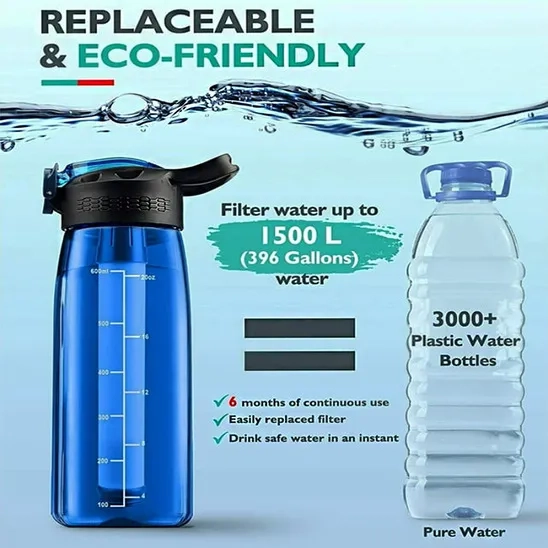 The Active Pure Clear water purifier bottle uses advanced electro-adsorptive technology and can remove 99.99% of bacteria, waterborne viruses, parasites, microplastics, cysts, chlorine, chemicals, heavy metals, and more. It is ideal for hiking, camping, or traveling to areas with poor water quality. You can also use this filtered water bottle in everyday general use to protect your body from tap water contaminants. The filter lasts up to 200 liters of water (2 months) with proper use and maintenance, and then should be replaced. This product is well made, durable, and has a lightweight and solid design. You can easily use and clean the bottle. The BPA/BPS-free design, featuring a silicone mouthpiece, guarantees every sip is clean and refreshing.