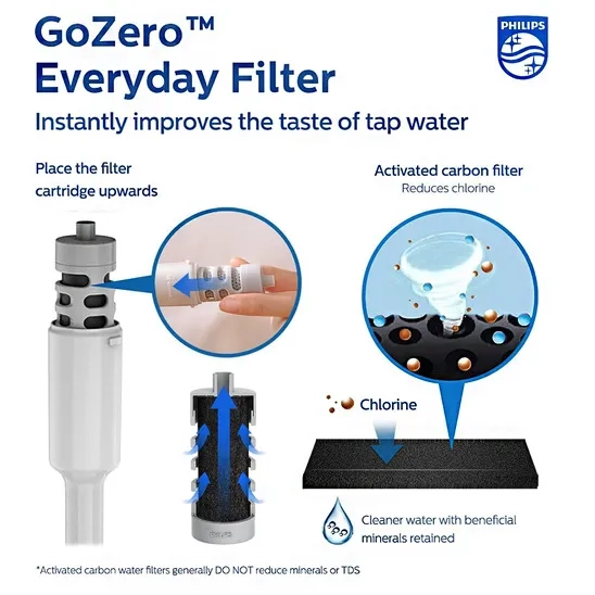 The Philips insulated water purifier bottle provides cleaner, and better-tasting drinking water with its activated carbon fiber filter. It instantly improves the taste of water by reducing chlorine and other contaminants that affect the taste and odor. You should note that the filter does not reduce minerals or TDS. To correctly install the filter, the small round opening of the filter should face upwards. This filtering water bottle is made of 18/8 food-grade stainless steel. This product can keep your water cold for up to 24 hours, due to its double-wall insulated body. This filtering bottle is eco-friendly and can replace up to 450 single-use plastic bottles. This leak-proof filtered water bottle is designed with a built-in carry loop and a cup-holder-friendly size, making it easy to take with you on the go. The product has a dishwasher-safe design (not the filter). The customer support team is always available to assist you.