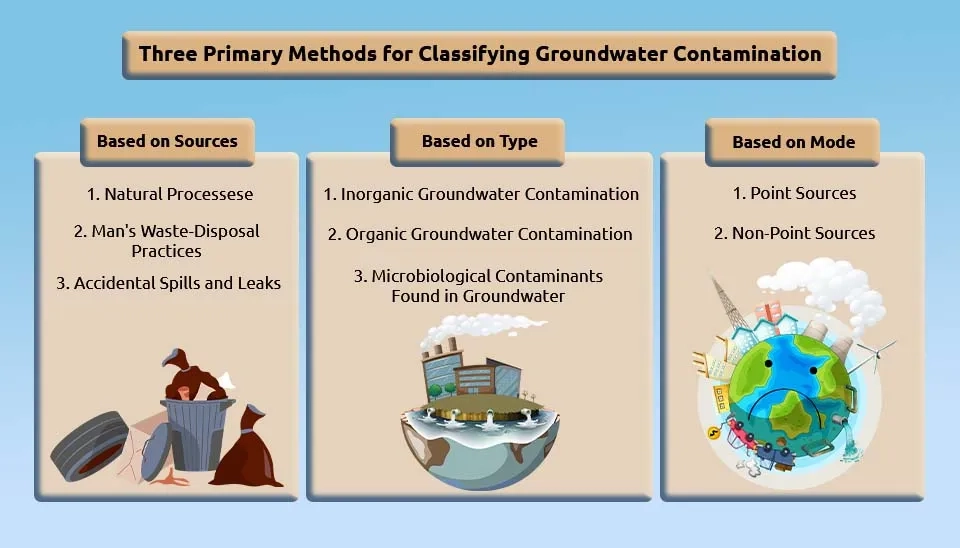 Urbanization, agricultural practices, industrial activities, and climate change all pose significant threats to groundwater quality. There are different methods in different sources for classifying groundwater contamination. In this article, we briefly introduce the three main methods of classifying groundwater contamination. These methods are 1) classification based on sources altering the chemical composition of groundwater, 2) classification of groundwater contaminants by type, and 3) classification by mode of contaminant release into groundwater.