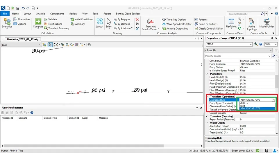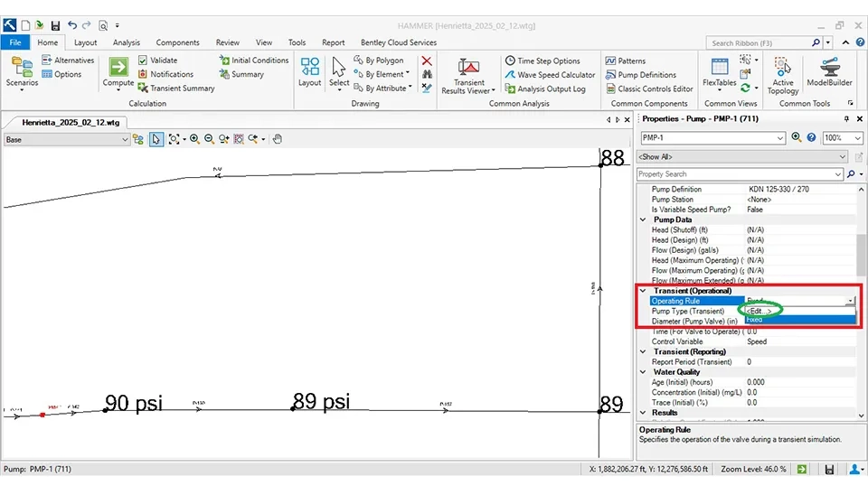 After importing information related to shutting down and starting the pump, select the pump in the "Operating Rule" in the drop-down menu under "Transient Operational" when the pump is selected (Fig. 16).