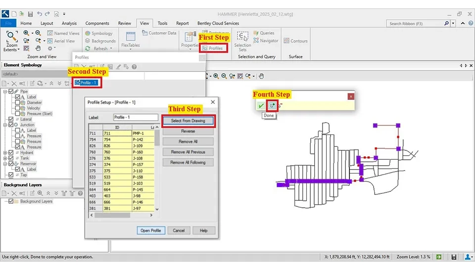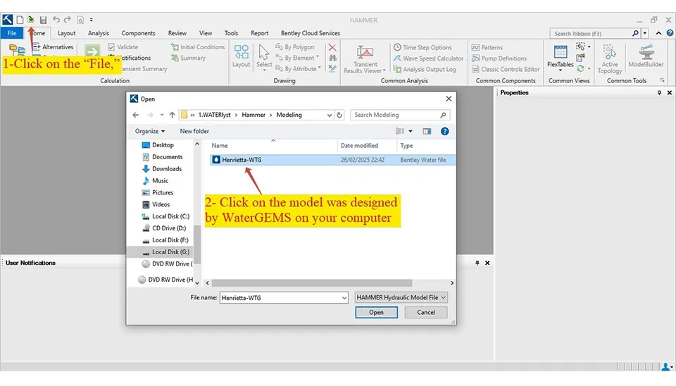 In the beginning, the model was created in WaterGEMS software. It needs to be opened with the HAMMER software. To do this, click on the "File," then click on the "Open" option, and next click on the "Browse" to locate and select the model that was saved by WaterGEMS software on your computer. When the model is opened in HAMMER, save it in the software's format (Fig. 4).