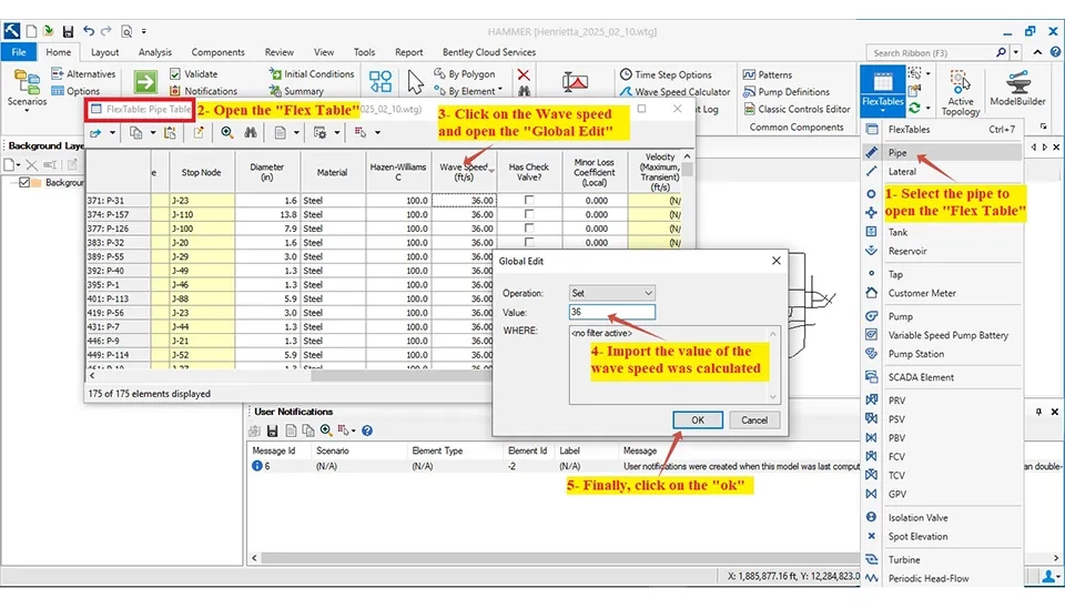 Also, it can import the wave speed at the same time for all pipes in a way that in the "Flex Table," you click on the wave speed and open the "Global Edit"; finally, it can import the value of the wave speed for all pipes (Fig. 6).