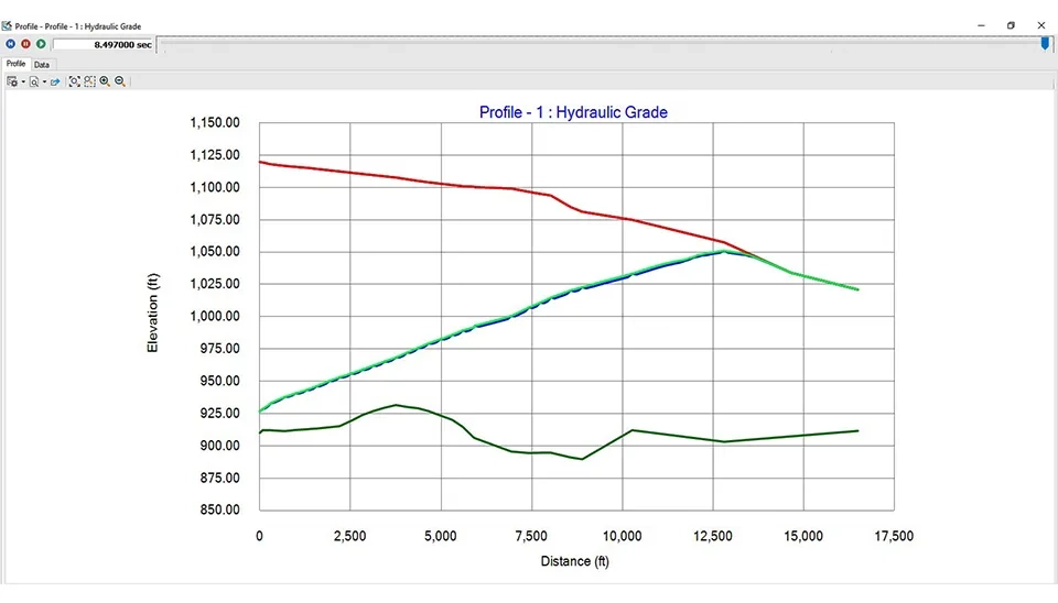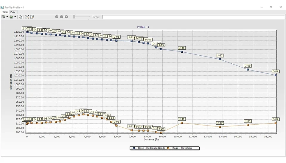 This diagram shows the hydraulic and topographic profile of a water system, which is usually used in the analysis of pipeline networks and water transmission pipes. In addition, the horizontal axis represents distance (ft), while the vertical axis indicates elevation (ft). The blue line illustrates the Hydraulic Grade Line (HGL), while the yellow line represents the topography. A decrease in the slope of the hydraulic line significantly causes a pressure drop along the path. So, this type of diagram is typically used to assess the adequacy of hydraulic design, pressure losses within the system, the potential occurrence of cavitation, and the optimization of piping routes.