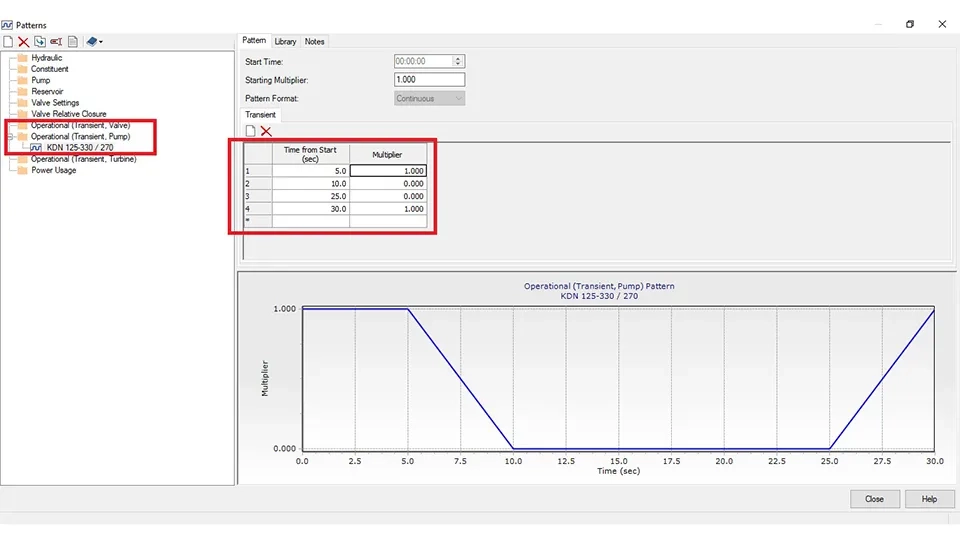 Then, a new window named "Patterns" will open, where the information for shutting down the pumps is imported for simulation. In addition, the "Operational (Transient Pump)" option is used for the pump’s settings.