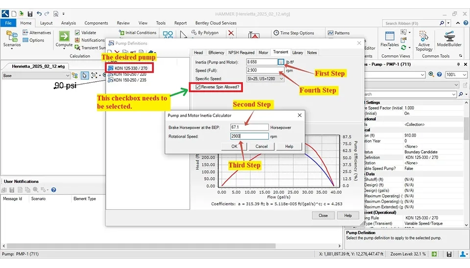 The last step must enter the essential information related to the pump, such as the "Flow," "Head," "Efficiency," and the information of the "Transient." WaterGEMS and Water HAMMER software import data like "Flow," "Head," and "Efficiency" similarly. However, the "Transient" settings also need to be configured in the Water HAMMER software. The "Transient" has two sections for entering information: the "Initial (Pump and Motor)" and "Speed (Full)." Also, the "Brake Horsepower at the BEP" and the "Rotational" are essential for calculating the "Initial (Pump and Motor)" (Fig. 17).