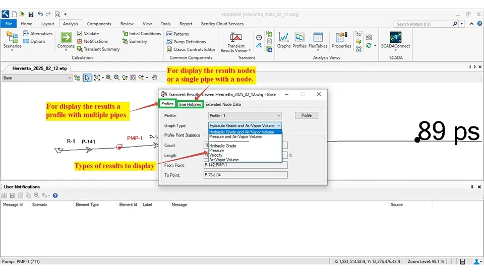 This method is Clicking on the "Transient Results Viewer" opens the "Transient Results Viewer" window, which includes components to display the results: a profile with multiple pipes and nodes or a single pipe with a node.