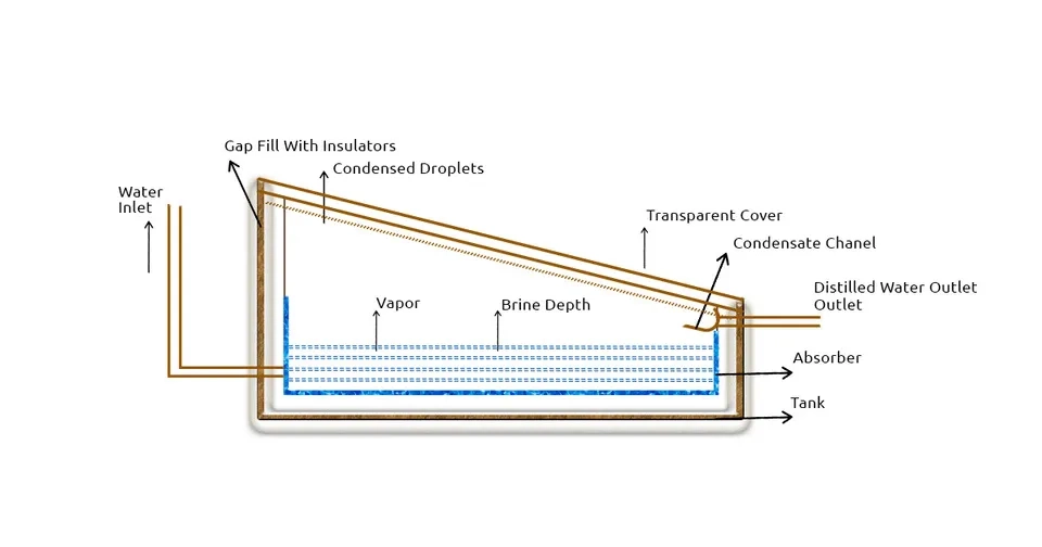 A conventional solar still is a box with a glass roof, referred to as a glaze, set at an angle from the horizontal to ensure optimal sun exposure. This angle is roughly equal to the latitude of the location. The distiller faces south if in the northern hemisphere, or north in the southern hemisphere. The domestic solar water distiller is an airtight basin constructed out of mild steel. The inner surface of the rectangular base is blackened to efficiently absorb the solar radiation, incident at the surface (Hassan et al. 2017).