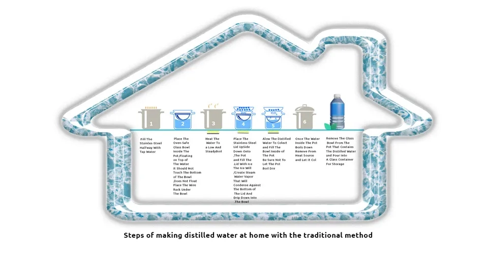 How to make distilled water with the traditional method at home with a pot is explained in the figure below. It is better to use stainless steel pot, which can fully guarantee the quality of distilled water.