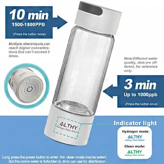 Bottle-based models, such as the ALTHY Molecular Hydrogen Water Generator Bottle, utilize proton exchange membrane (PEM) electrolysis, which ensures high-purity hydrogen but comes with a higher price due to the use of platinum and other advanced materials. However, the PEM technology is sensitive to water quality, especially ions like chloride, and the membrane can degrade over time. On the other hand, the Echo Go+ Hydrogen Water Bottle uses alkaline electrolysis, which is more affordable but slower in producing hydrogen-rich water. These bottles often feature borosilicate glass or a combination of glass and plastic, providing non-reactive and durable solutions, though they can be heavier and fragile.