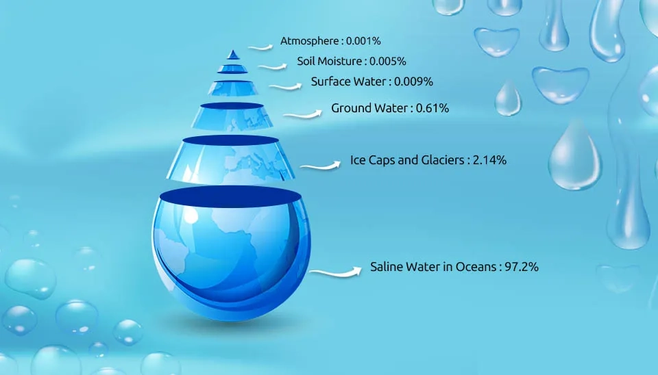 Although water is always present in nature, its uneven distribution has made it a challenge to obtain it at the required time and place. To better understand the water resources in the world, you should know that 1,350,400 (103 km3) of water circulating in the hydrological cycle are stored in the oceans and 26000 (103 km3) are made up of glaciers and polar ice. Among them, the share of underground water is 7000 (103 km3), and the lakes and inland seas are only 230 (103 km3), all of which are necessary for the survival of humans and other creatures. These statistics show that more than 99% of the water on the planet cannot be used directly and need to go through various processes to become fresh water that can be used for various purposes such as drinking, agriculture, and industry. The amount of renewable water available worldwide is only 29.7 km3 (Jayawardena, 2022).