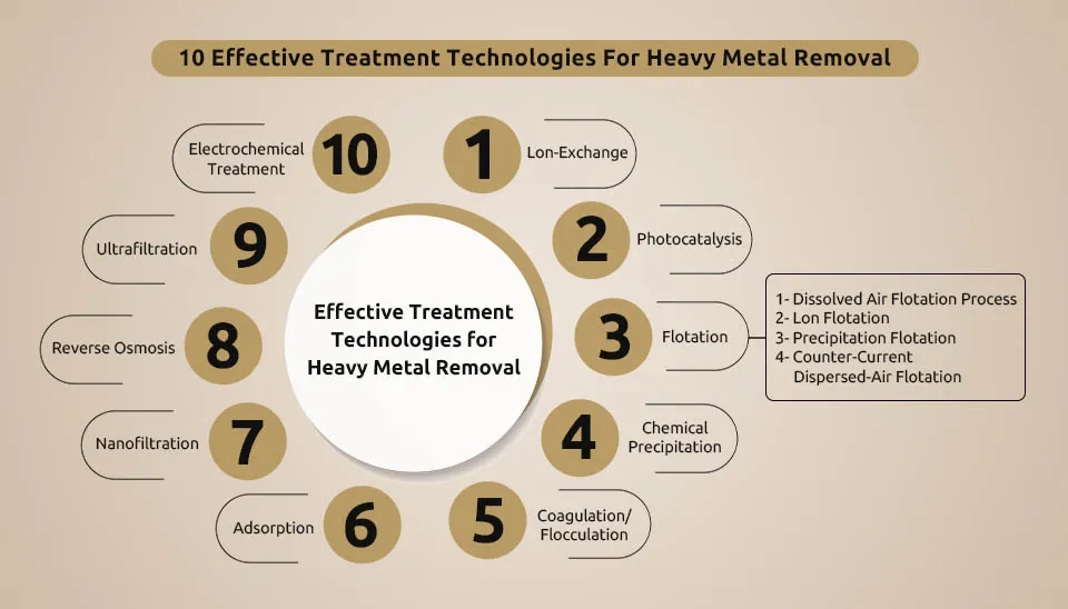 We implement numerous principles to recover heavy metal wastewater and achieve metal-free status. Choosing a suitable technology for treatment depends upon its efficiency in the removal of heavy metal ions of As, Cd, Cr, Cu, Pb, and Hg forever (Saleh et al., 2021). According to recent studies, there are 10 effective treatment technologies for heavy metal removal, which are shown below.