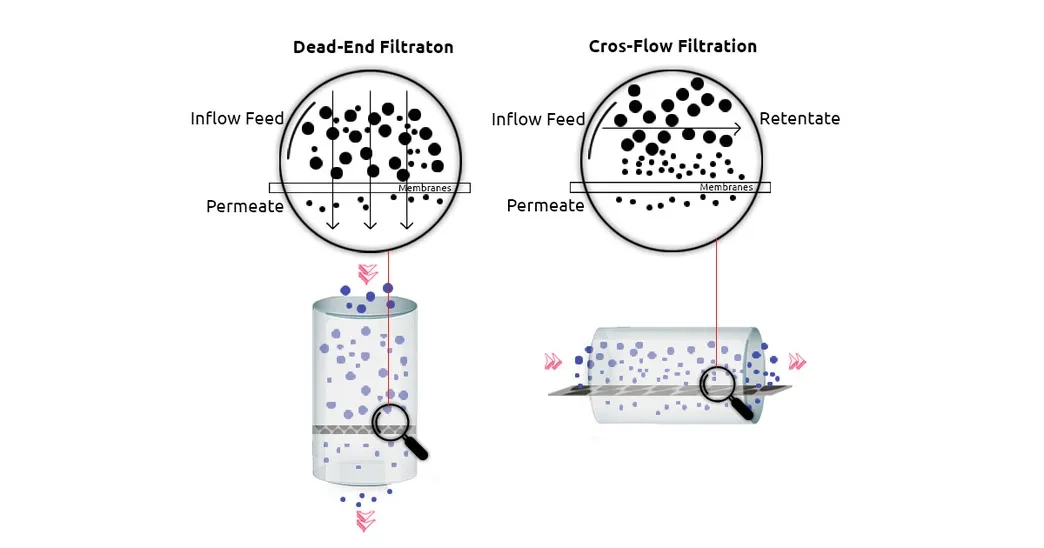 Filters can operate in two different modes. In dead-end filtration, the flow is perpendicular to the membrane; as a result, the particles accumulate on the membrane and form a cake layer over time, which reduces the filter’s efficiency. Cross-flow is an improved form of filtration where the inflow is parallel to the membrane surface. In this mode, the cake layer is thinner because some of the particles exit along with the retentate flow (Abdel-Fatah, 2018).