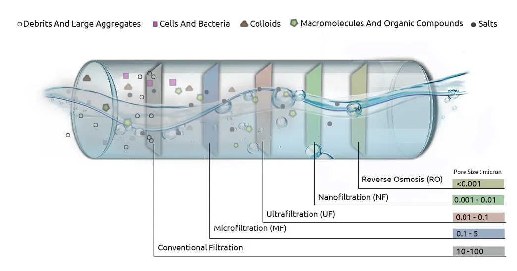 Membrane filters are categorized into four main types including MicroFiltration (MF), UltraFiltration (UF), NanoFiltration (NF), and Reverse Osmosis (RO) (Chao et al., 2018).