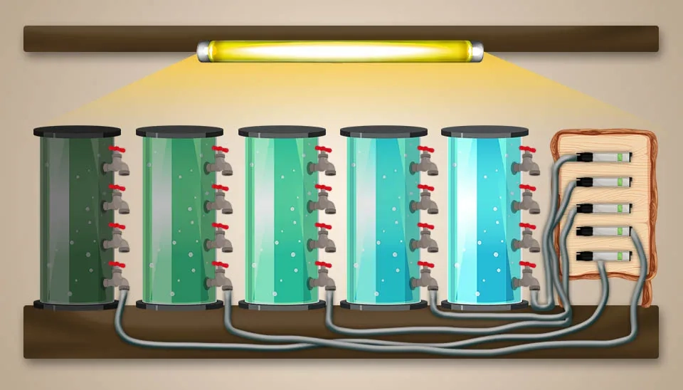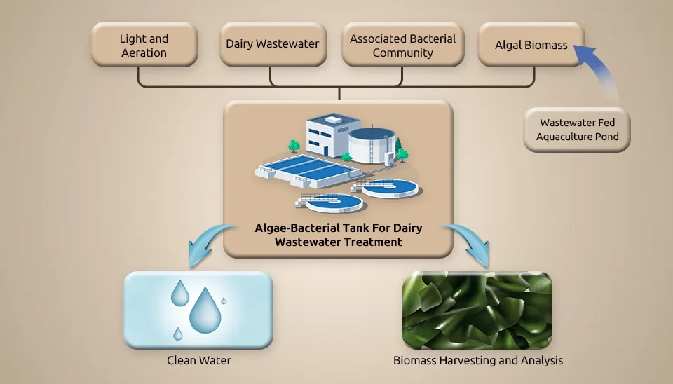 Feng et al. (2020) investigated the performance of a microalgal-bacterial consortium system for treating dairy-derived liquid digest and biomass production. They introduced a new microalgal-bacterial consortium system (co-culture) to enhance Dairy-derived Liquid Digestate (DLD) treatment using a microalgal-bacterial consortium system composed of Chlorella vulgaris and indigenous bacteria, activated sludge. Before the experiment, the liquid digestate collected from a dairy farm in Kaiping (China) was centrifuged and filtered by Whatman glass microfiber filters to remove large particles and stored in a 4°C refrigerator until further use. The liquid digestate had to be diluted due to the significant inhibition of microalgae cell growth. Due to the considerable inhibition of algal cell growth in the raw liquid digestate, it had to be diluted. The ideal alternative medium was 25% DLD for biofuel generation and nutrient removal. The concentrations of COD, TN, NH4 +-N, and TP in the 4 times diluted liquid digestates were 390 ± 1, 162 ± 1, 135.5 ± 0.5, and 20.23 ± 0.07 mg L-1, respectively. Chlorella vulgaris NIES-227 was kept in BG-11 medium and pre-cultured in an air-lift Photo Bio Reactor (PBR) with a 5.0 cm diameter and 60 cm height at room temperature and a light intensity of 200 μmol m−2 s−1 with 24 hours of illumination. Aeration was done at 0.3 vvm with 2% CO2-enriched air at the bottom of the PBR. Pre-cultured microalgae cells were gathered to adapt to the liquid digestate medium and add to the log phase. For C. vulgaris, acclimation was consecutively cultivated on digestate concentrations of 5%, 15%, and 25% in PBR within a semi-continuous growth method. Half the volume of the culture was raised, and freshly diluted digested liquid was added to the culture in the log phase. Finally, C. vulgaris was maintained at 25% digestibility and utilized for further tests. All tests were applied in the PBRs using four times diluted liquid digestate as wastewater. The initial concentration of C. vulgaris was about 0.5 g L⁻¹. The addition of activated sludge in the culture increased the specific growth rate of C. vulgaris by about 0.56 d⁻¹ due to the shortened lag phase. The biomass yield in C. vulgaris (3.24 g L⁻¹) was higher than in the co-culture (2.72 g L⁻¹), but COD removal of the co-culture (25.26%) was higher than in C. vulgaris (13.59%). Metagenomic and polymerase chain reaction (PCR) analyses showed that C. vulgaris also improved bacterial growth but unexpectedly affected the bacterial communities of indigenous bacteria and activated sludge. Activated sludge was a more desirable symbiosis with C. vulgaris than indigenous bacteria. These results confirmed the manufacturing of an effective microalgal-bacterial consortium system for wastewater treatment.