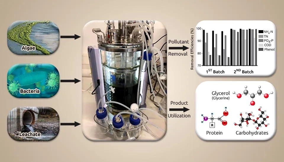 Tighiri and Erkurt (2019) investigated the biotreatment of landfill leachate by a microalgae-bacteria consortium in sequencing batch mode. The coexistence of microalgae and bacteria played an imperative role in leachate treatment and biomass generation for biorefinery purposes. Microalgae strains (Chlorella sp., Scenesdesmus sp., Stigeoclonium sp.) and Cyanobacteria (Microcystis sp., Oscillatoria ssp.) were taken from the aerobic oxidation section of the wastewater treatment plant in Nicosia, examined under a microscope, and then grown in BG11 medium for 14 days in a photobioreactor with a light intensity of 76 μmol m-2s-1 and a speed of 75 rpm at 28°C. The tests were conducted in a photobioreactor with a 10 L volume and 5 L loading with 10% (v/v) diluted landfill leachate in a sequencing batch. The pH, temperature, and DO were automatically maintained within a range of 6.5–8.5, 25 ± 1°C, and 5.0–8.0 mg L⁻¹, respectively. The starting biomass of bacteria and microalgae was kept at a 3:1 ratio for all cycles. We took this action to boost the microalgae biomass and prevent the bacteria from dominating the MBC system for biorefinery purposes. Microalgae and bacteria initial concentrations were 0.343 g L-1 and 0.115 g L-1 for cycle I, 0.339 g L-1 and 0.112 g L-1 for cycle II, and 0.354 g L-1 and 0.117 g L-1 for cycle III, respectively. The initial biomass concentration was improved to start the second batch, which consists of three consecutive cycles. The biomass concentration of microalgae and bacteria increased to 1.338 g L-1 and 0.439 g L-1 for cycle I, 1.341 and 0.446 gL-1 for cycle II, and 1.364 g L-1 and 0.455 g L-1 for cycle III, respectively. NH4+-N was wholly removed from the leachate in both batches. NO3-, COD and phenol removal efficiencies were above 90% in the 2nd batch. At the end of the second batch, the relative toxicity had reduced from 57.32 to 1.12%. The fatty acid content (C16:18) rose from 86.72 to 87.69% in the second batch and fell from 85.47 to 87.65% in the first batch. Also, in the 1st batch, the crude glycerol content increased from 34.54 to 42.36%, and in the 2nd batch, from 33.64 to 39.55%.