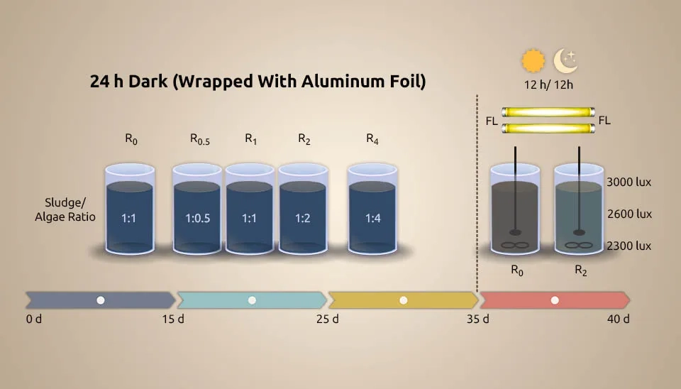 ( Fan et al. 2019) systematically evaluated wastewater treatment by MBC, a Chlorella sorokiniana-activated sludge consortium, under dark heterotrophic conditions with a period of 12h/12h light/dark for the first time. Light limitation often occurs in the MBC. C. sorokiniana (10% (v/v)) was inoculated into 250 mL Erlenmeyer flasks containing 100 mL synthetic wastewater and improved for 3 days in an incubator under the following conditions: light intensity of 2000 lux, 12h/12h light/dark, 25°C, and shaking the flasks by hand 3 times/d. Activated sludge was collected from the aeration tank of the LBZ municipal WWTP in Wuhan, China. The activated sludge was cultured with synthetic wastewater in the lab, following cycles of anaerobic (2 h), aerobic (4 h), and settling (1 h), maintaining Mixed Liquid Suspended Solids (MLSS) at 2500 mg/L. The tests were done in wide-mouthed glass bottles with 1 L of synthetic wastewater at room temperature (25±2°C). The wastewater went through an anaerobic-aerobic cycle, which included feeding for 5 minutes, anaerobic for 2 hours, aerobic for 4 hours, settling for 1 hour, and decanting for 5 minutes. Microalgae and sludge depleted DO in manufactured wastewater after 7–15 minutes of magnetic stirring, and the anaerobic phase then continued to stir continuously at 120 rpm. We maintained DO, Solids Retention Time (SRT), and HRT at 2-4 mg L-1, 15 d, and 12 h, respectively. Chlorella sorokiniana grows in heterotrophic, autotrophic, and mixotrophic conditions. The sludge/microalgae ratio with ratios of 1:2 and 1:0 is introduced as R2 and R0. In the 1:2 ratio, nutrient (NH₄⁺-N and P) and COD removal efficiency were better than in the 1:0 ratio. Less O2 utilization of MBC than activated sludge made energy saving conceivable. Also, Fan et al. investigated interaction, which made the MBC ratio reversal 3:1. The ability of heterotrophic bacteria to handle glucose better than Chlorella sp., along with their interaction through substances like indole-3-acetic acid, siderophores, vitamins, and algicides released by bacteria, could explain why bacteria became more dominant in the MBC. Increased levels of cofactors and vitamins were the reason why microalgae and bacteria interacted more cooperatively. Secondary metabolites of terpenoids and polyketides were responsible for the less cooperative interaction between microalgae and bacteria. Despite oxidative stress within the dark consortium, microalgae photosynthesis reactivates when exchanged for light. The execution arrangement was light consortium > dark consortium > activated sludge. Nitrosomonas and Dechloromonas were improved for nutrient removal. The results show better removal efficiency of MBC over activated sludge, whether with or without light.