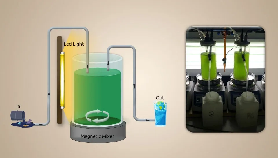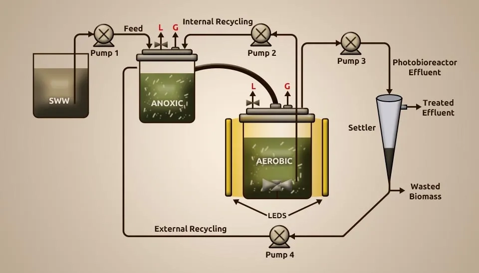 Alcántara et al. (2015) studied how well a new anoxic-aerobic algal-bacterial photobioreactor cleaned up wastewater by looking at carbon and nitrogen mass balances and biomass recycling. The anoxic and aerobic tanks were first filled with 3.2 grams per liter of total suspended solids (TSS) made up of bacteria and microalgae from wastewater treatment using High-Rate Algal Ponds (HRAP) that processed diluted vinasse and aerobic activated sludge from the Valladolid wastewater treatment plant. The MBC utilized as immunization was first settled, and the biomass was resuspended in synthetic wastewater (SWW) prior to inoculation in both reactors. The dissolved Total Organic Carbon (TOC), dissolved IC, and N-NH4+ were 200 mg L-1, 250 mg L-1, and 120 mg L-1, respectively. The experimental setup comprised an anoxic tank interconnected to a PBR. The PBR was an encased 3.5-L glass tank with a total working volume of 2.7 L. The PBR was continuously under light intensity 400±51 µE m⁻² s⁻¹, temperature 24±1 °C, magnetic agitation 300 rpm, and pH 7.8±0.1. The anoxic reactor comprised a gas-tight L polyvinyl chloride tank with a total working volume of 0.9 L kept in the dark and magnetically blended at 300 rpm. The SWW, already sterilized at 121ºC for 20 min and kept up at 7ºC, was nourished in the anoxic tank and continuously overflowed by gravity into the aerobic photobioreactor. The MBC was continuously recycled at 3 L d⁻¹ from the PBR to the anoxic tank to provide the NO2 and NO3 required for denitrification. A 1L Imhoff cone interconnected to the PBR outlet was used as a settler. The algal-bacterial biomass settled was reused from the foot of the pioneer into the anoxic tank at 0.5 L/d and squandered three days a week to control the algal-bacterial SRT. We used a creative anoxic-aerobic photobioreactor setup to reuse the biomass. This process effectively removed TOC (86–90%), IC (57–98%), and TN (68–79%) during SSW treatment, with hydraulic retention time of 2 days and sludge retention time of 20 days. How easily IC got into the PBR from the wastewater and how active the microalgae were showed how much nitrogen was taken out by absorption or nitrification-denitrification. Nitrate generation was unimportant despite the high DO concentrations; denitrification was based on nitrite reduction. Using recycled biomass increased the amount of quickly settling algal flocs, which kept the TSS levels in the effluent below the maximum release limits set by the European Union. Lastly, the highest levels of nitrous oxide emissions were much lower than those found in wastewater treatment plants. Results show that this PBR can be kept up without causing global warming problems.